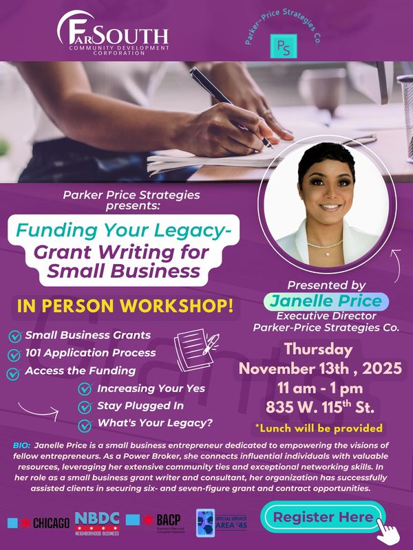 Join us and @farsouthcdc Far South CDC for Funding Your Legacy, an empowering workshop where small business owners and entrepreneurs will learn how to access funding and strengthen their grant writing skills.